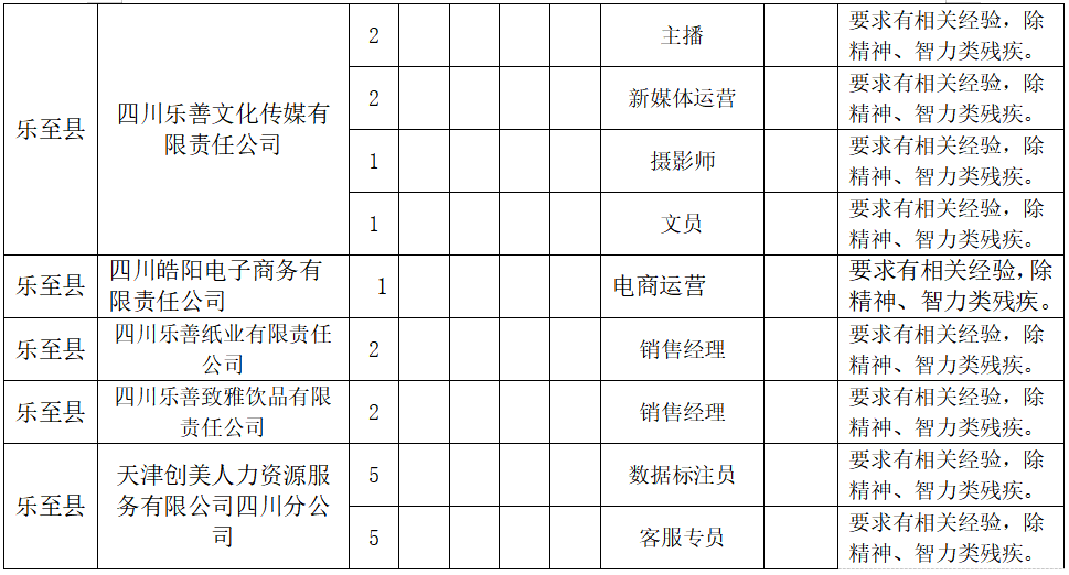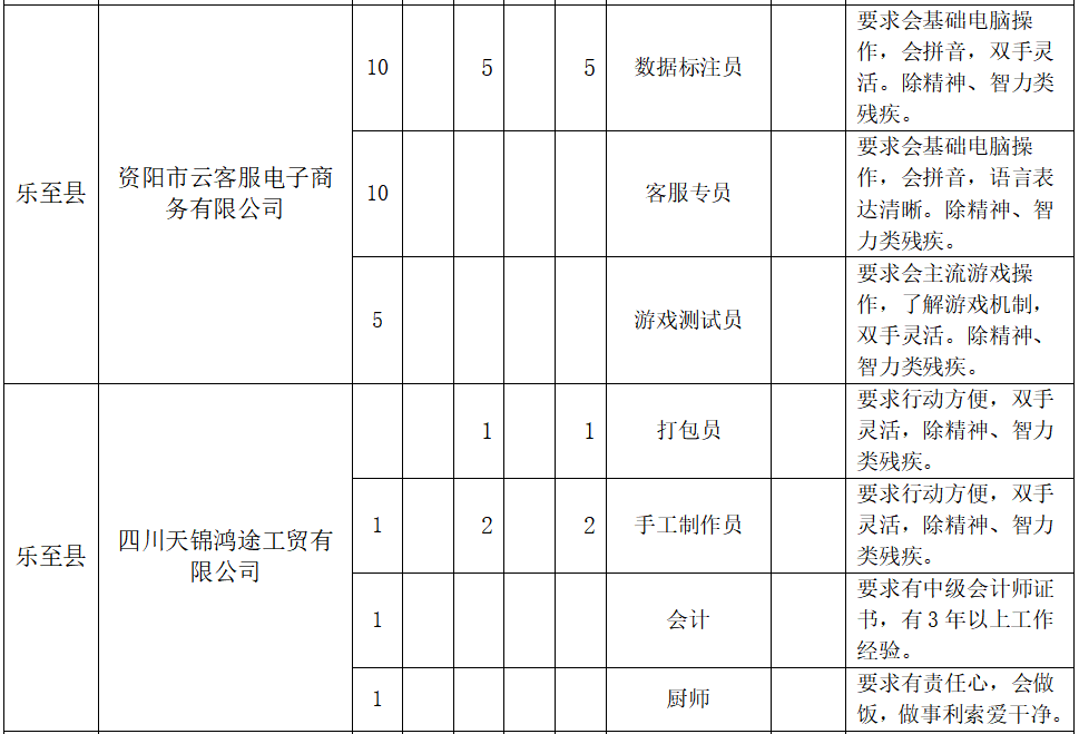 冬日虽寒,机会很暖。一份理想的工作,是融入社会、实现自我价值的重要一步。为全力搭建残疾人及各类求职者与用人单位之间的双向奔赴桥梁,由乐至县残疾人联合会、乐至县人力资源和社会保障局联合主办的“同心筑梦,才显未来”残疾人专场招聘会将于12月9日(周二)举行。这是一场充满诚意与机遇的盛会,旨在以切实行动促进包容性就业,助力每一位追梦人书写精彩职业生涯。 本次招聘会汇聚了乐至县睿至人力资源有限公司、资阳市云客服电子商务有限公司等本地重点企业,以及来自成都周边共计30余家优质用人单位,将累计提供超过80个适残岗位。现场特设残疾人招聘专区,岗位经过精心筛选,更贴合不同残疾类型求职者的实际能力与需求,如耐心细致的数据标注员、沟通灵活的客服专员、发挥巧思的手工制作员等,工作条件友好,适配度高。 与此同时,招聘会同样开放适合健全人岗位60余个。 时间:2025年12月9日(星期二) 上午9:00—下午4:30 地点:乐至县陈毅广场 若您对活动或岗位有任何疑问,欢迎提前致电: - 代老师:18349922547 - 王老师:18086965027 招聘岗位: